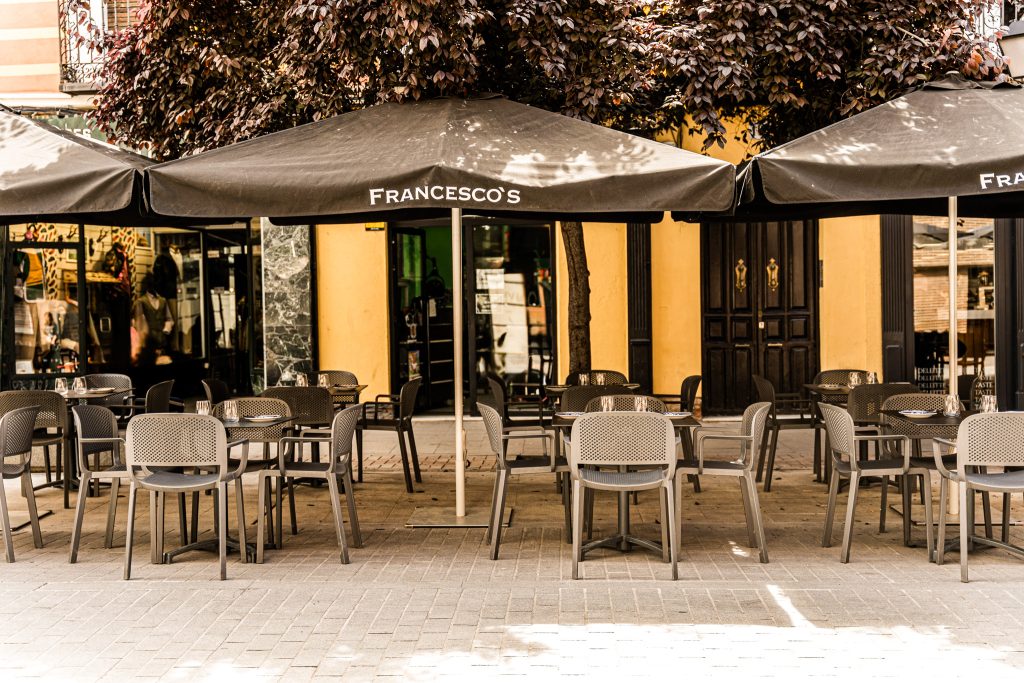 Imagen de la terraza del restaurante Francesco’s, calle Libreros, Alcalá de Henares.