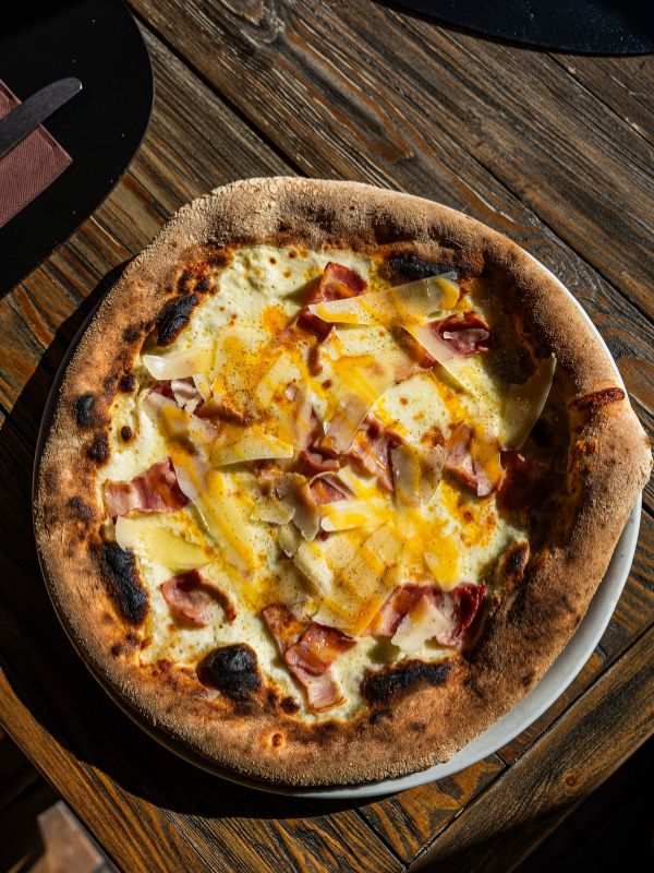 Un clásico irresistible: Nata, mozzarella, bacon ahumado, yema de huevo, pimienta y láminas de parmesano.